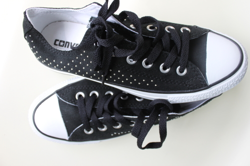 Sneakers: I am a fan of Converse sneakers and I have had several pairs over the years. Not so long ago I put my last remaining, bedraggled beyond belief, pair in the bin. This left me with a dilemma, do Converse sneakers have a cut off age and horror of horrors have I passed it. I was beginning to tend towards the view that I had, when I remembered that I had seen several chic Converse-shod women of a certain age walking around Paris. (one sign from the universe). Then a couple of weeks ago I read this Converse conversation click here on Tish Jett’s excellent ‘A Femme d’un Certain Age’ blog (second sign from the universe). Yesterday when I spotted the studded pair, pictured above, I didn’t wait for a third sign from the universe, I just bought them.