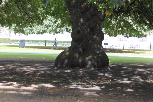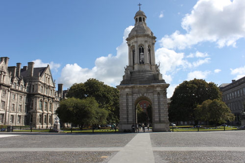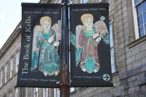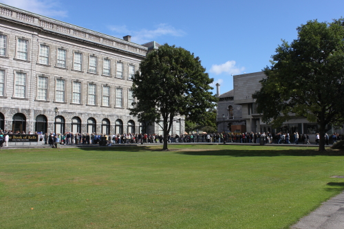 I headed to Trinity College, a university founded by  Queen Elizabeth 1 in 1592. Once through the main gate, I was in a world far removed from the surrounding urban cacophony; a forty acre plus site filled with cobbled quads, ancient imperious grey-stoned building, grassy squares, centuries old trees and verdant playing fields.  I was not alone as there was a long snaking but fortunately swift moving queue, waiting to get access to the library building where the Book of Kells is kept (I was there just after the 12 noon Sunday opening time, it’s apparently much quieter later in the afternoon).