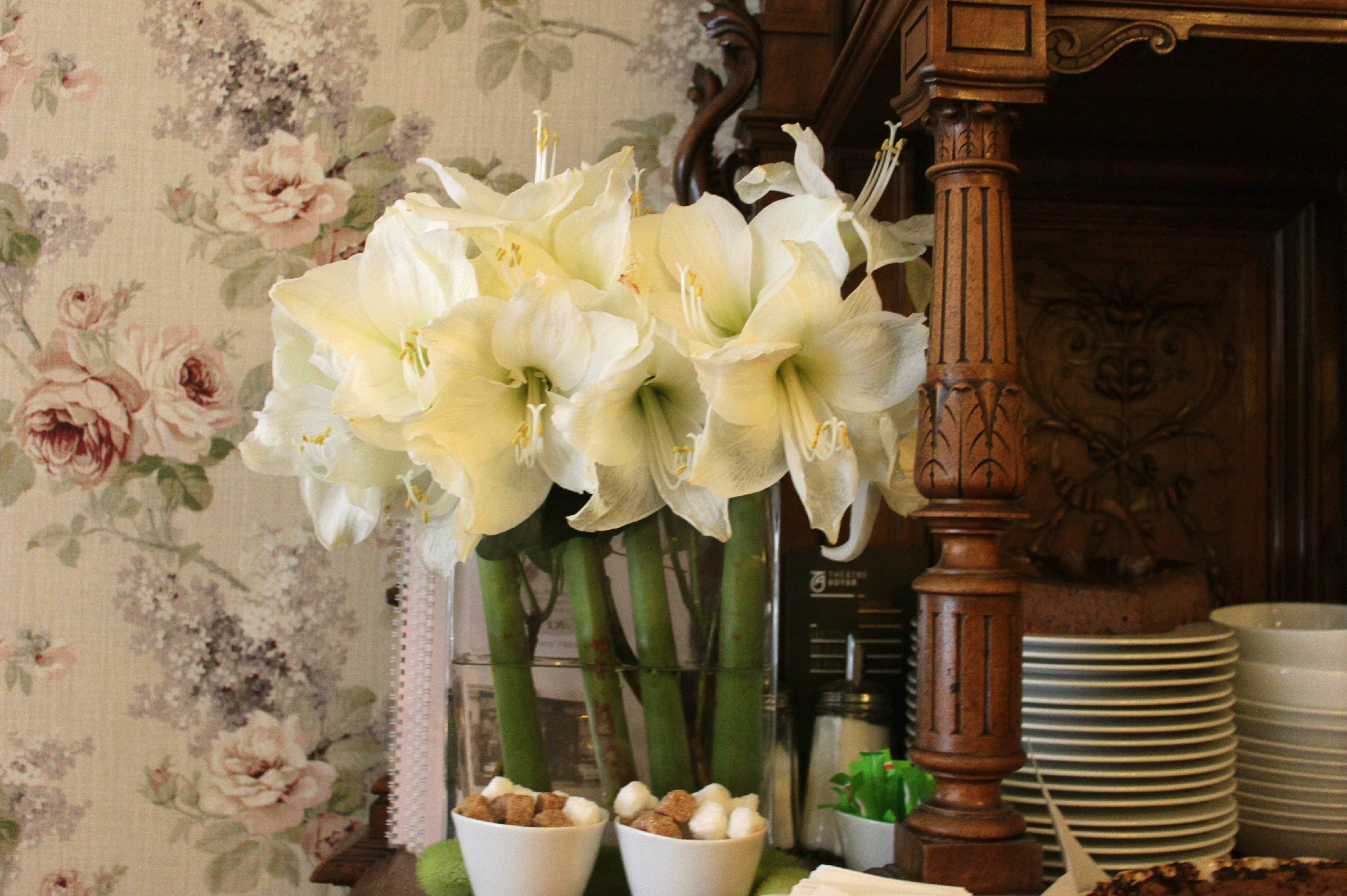 The interior of the café is so very pretty. Some of the walls are painted white and others are clad in a beautiful flower print linen in muted tones. The floor is in some parts wooden and in others covered with honeycomb-like terracotta tiles. And there are simple chairs around tables covered with pristine white cloths. A large ornate carved dark wooden dresser with a slightly gothic feel acts as a counterpoint to all this daintiness but even it is prettified with flowers, china and a display of tempting edible treats.