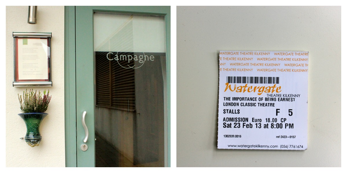 So how did the four-go-to-Killkenny-to-celebrate-a-birthday trip go? Wonderfully well. We had the main celebration on Saturday night starting with an early meal in Campagne restaurant and then we headed to Kilkenny’s Watergate Theatre where we saw the travelling London Classic Theatre company perform Oscar Wilde’s The Importance of Being Earnest and we topped off the evening with a celebratory night-cap in a local bar.