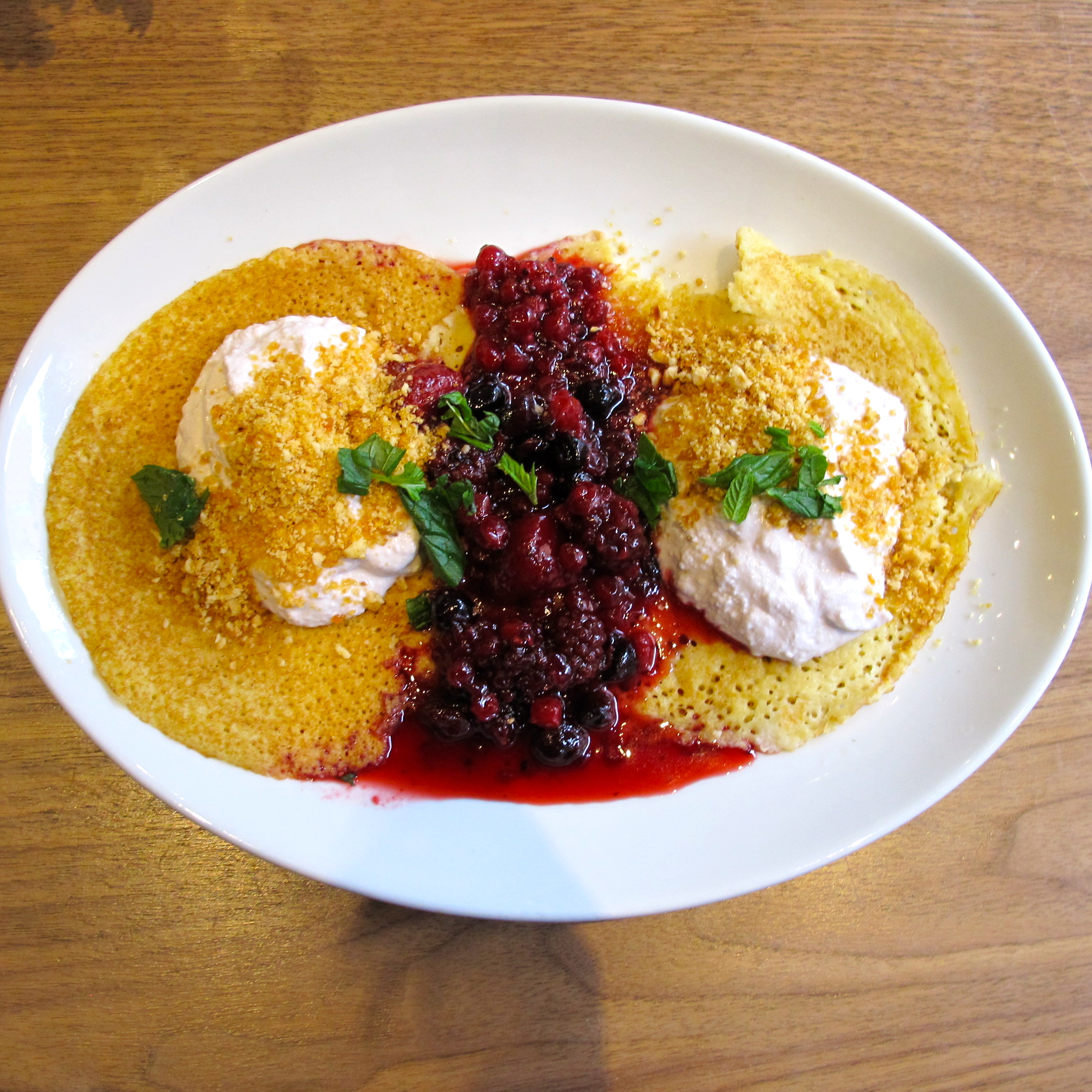 I ordered from the brunch menu which is served from ten to four thirty on Saturdays and I feasted on Moroccan-style semolina pancakes served with a sweet ricotta crème, summer berry & rose compote and topped with a hazelnut-almond praline. I enjoyed the pancakes hugely, I didn’t try to analyze the individual elements but the flavours melded together beautifully and the whole was divinely delicious. The flat white with soya milk that I had after the pancakes was also excellent.