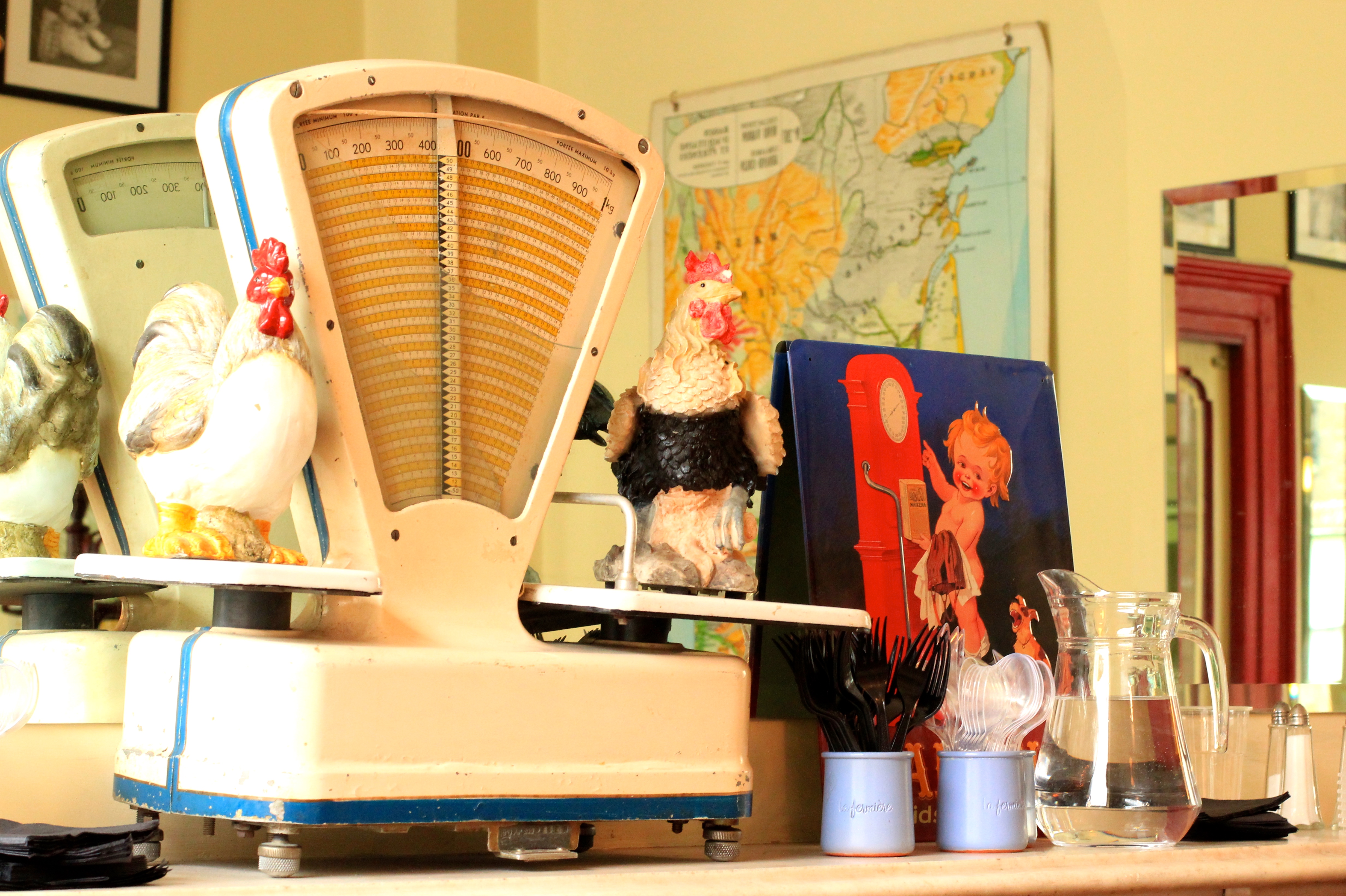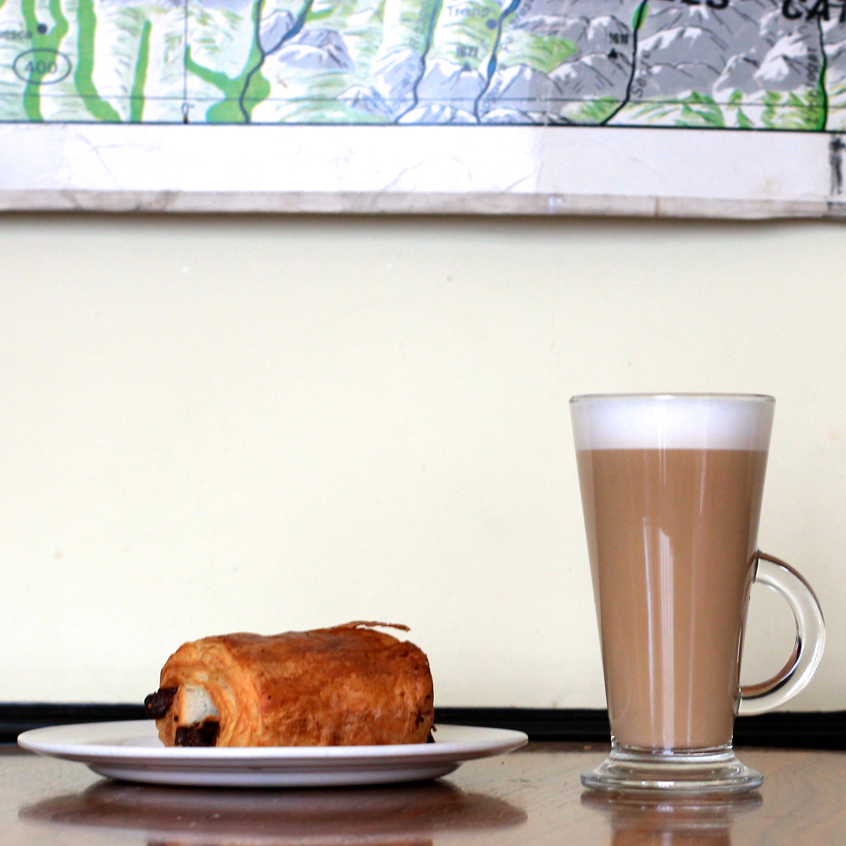 The room that houses the coffee shop has a dark planked wooden floor, a stunning marble fireplace, and a chic light fitting dangling from the ceiling. There are tables and stools a plenty, French bric-à-brac scattered around as decoration, and framed black and white images march around the walls close to where they meet the ceiling. French radio burbles away in the background.