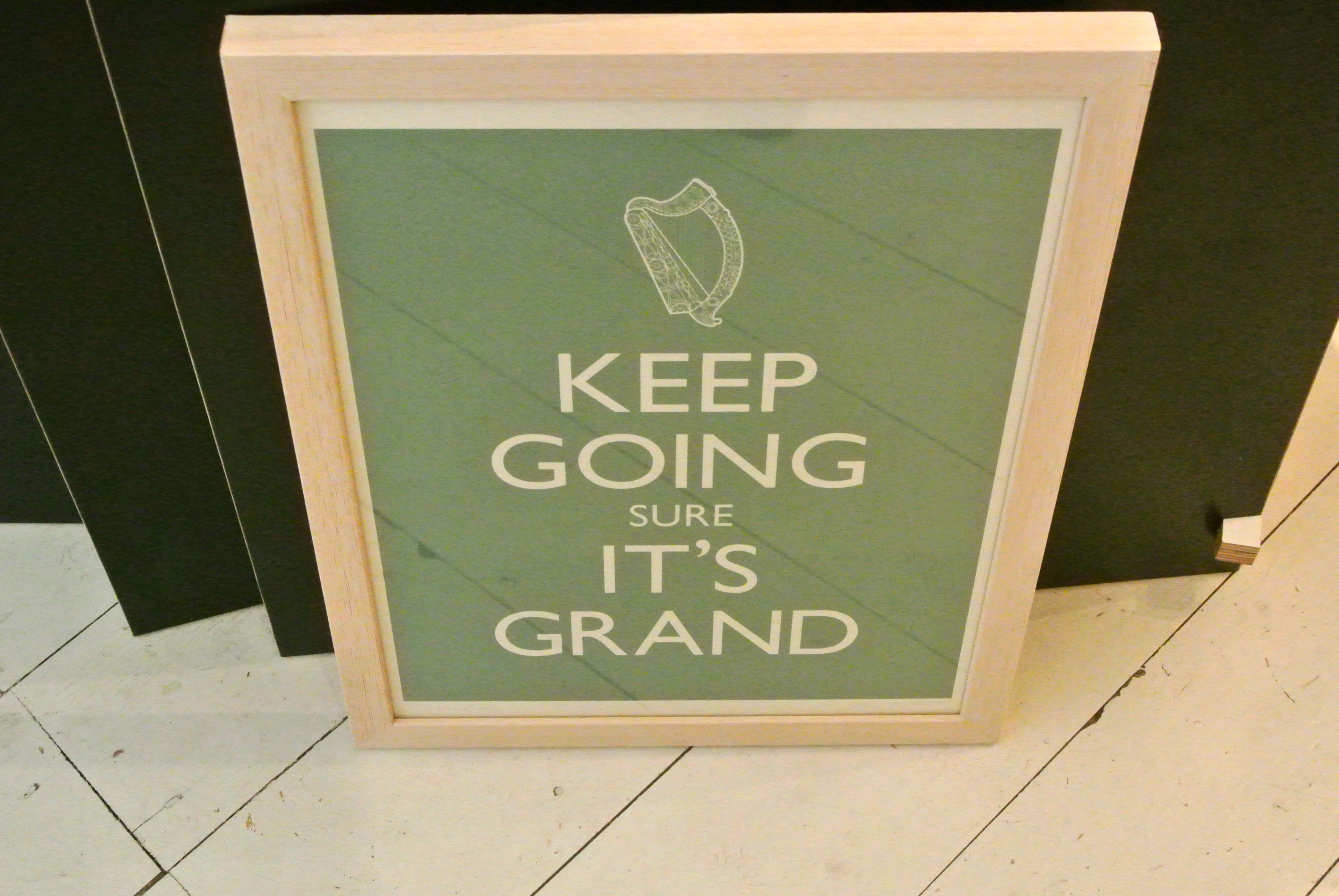 George Bernard Shaw described America and England as two countries separated by a common language. Perhaps because he was Irish he didn’t delve into the differences between English as spoken in Ireland and English as spoken in the rest of the Anglophone world. I was reminded of one of the differences when I saw the ‘KEEP GOING SURE IT’S GRAND’ poster in the Irish Design Shop before Christmas. Here in Ireland we pepper our everyday conservation with words or phrases that are probably incomprehensible to visitors to these shores. Here’s a small selection.