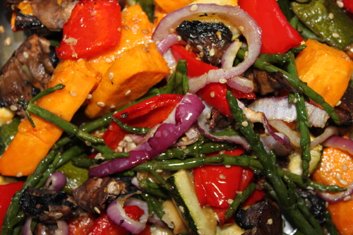 I needed an antidote to the overdose of carbs and calories I consumed this weekend. So I had a simple dish of roasted vegetables for supper this evening. Roasted veggies are a great way of incorporating the recommended five a day servings of fruit and vegetables into your daily diet; making them is simplicity itself.